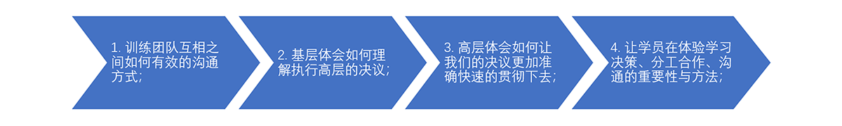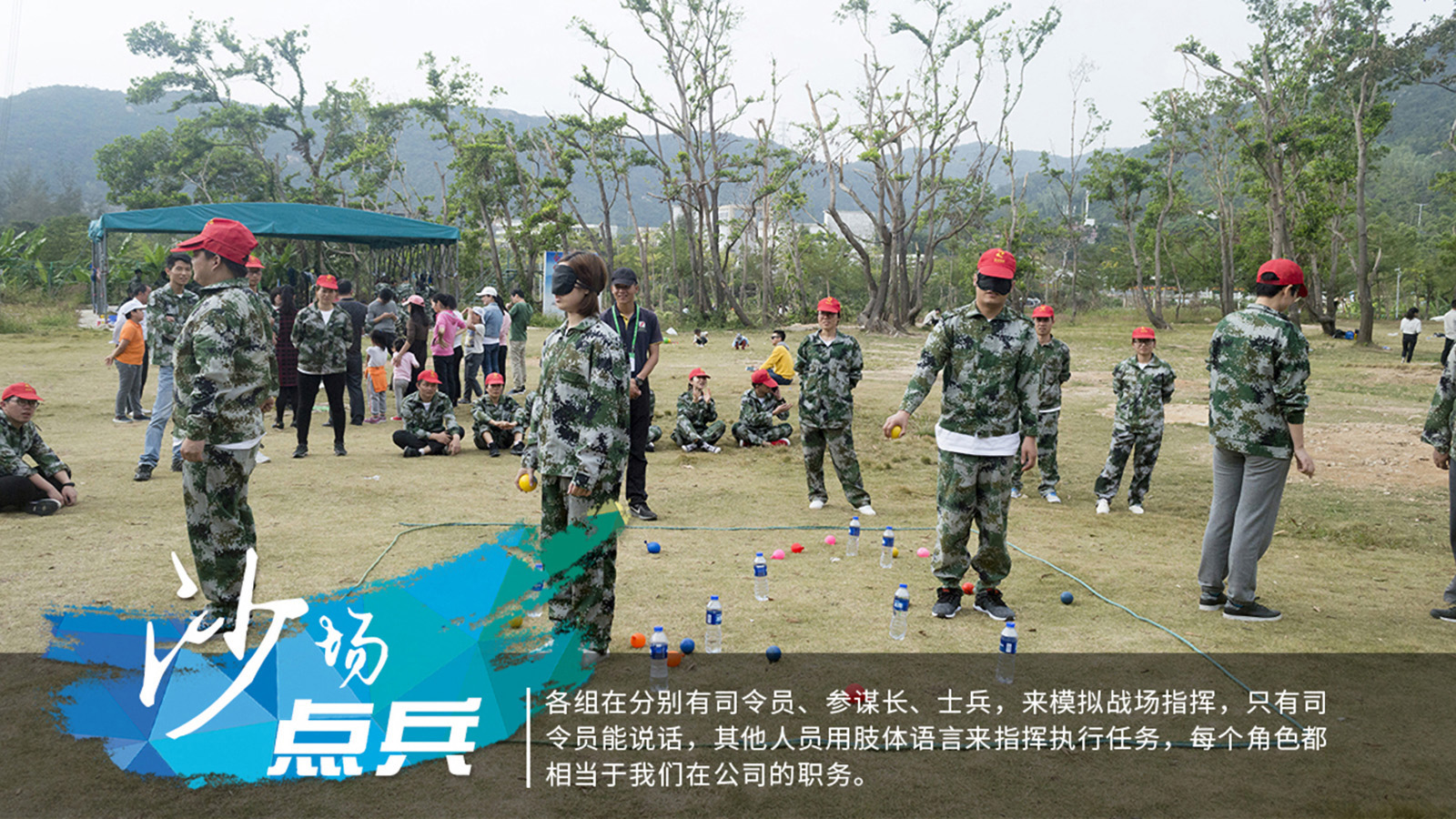 各组在分别有司令员、参谋长、士兵,来模拟战场指挥,只有司令员能说话,其他人员用肢体语言来指挥执行任务,每个角色都相当于我们在公司的职务。