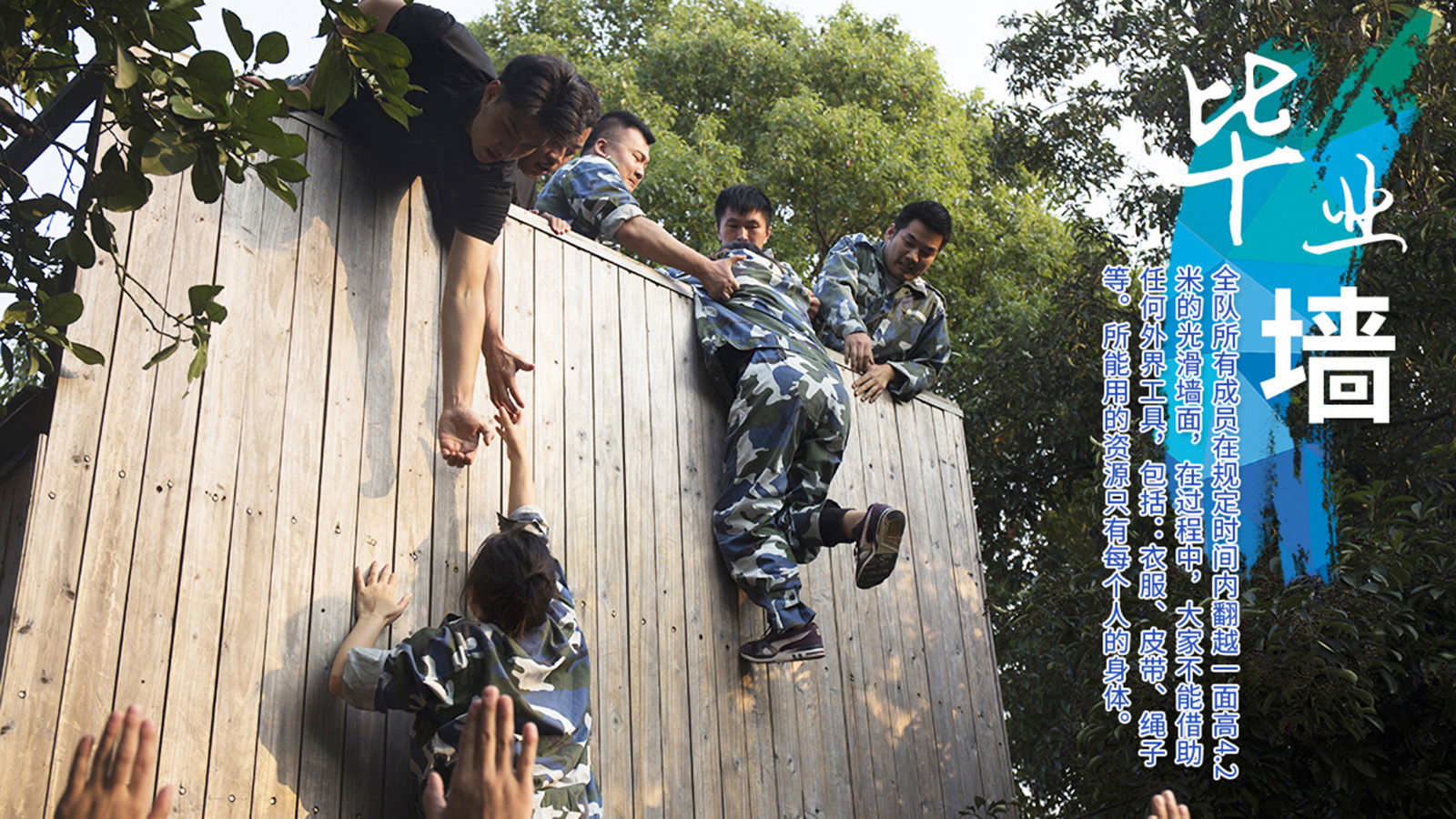 所有成员在规定的时间内翻越一面高达4.2米的光滑墙面,在此过程中,大家不能借助任何外界的工具,包括:衣服、皮带、绳子等。所能用的资源只有每个人的身体。