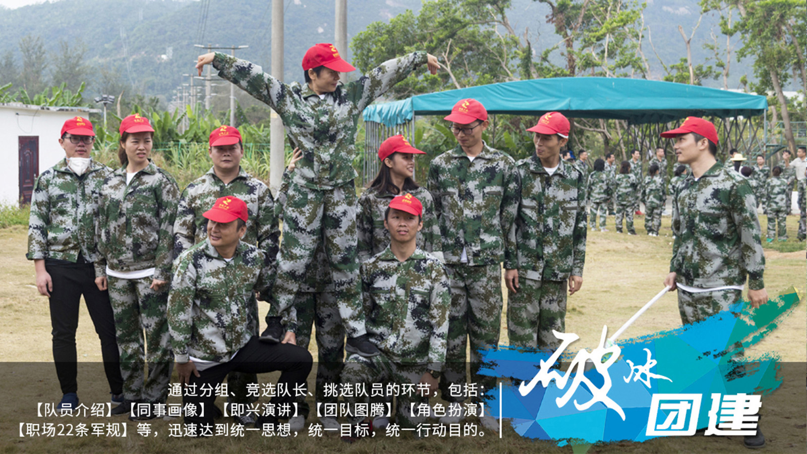通过分组、竞选队长、挑选队员的环节,包括但不局限于【队员介绍】【同事画像】【即兴演讲】【团队图腾】【角色扮演】等,