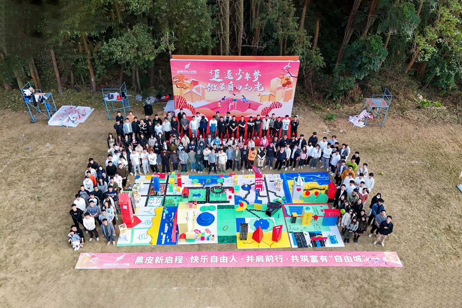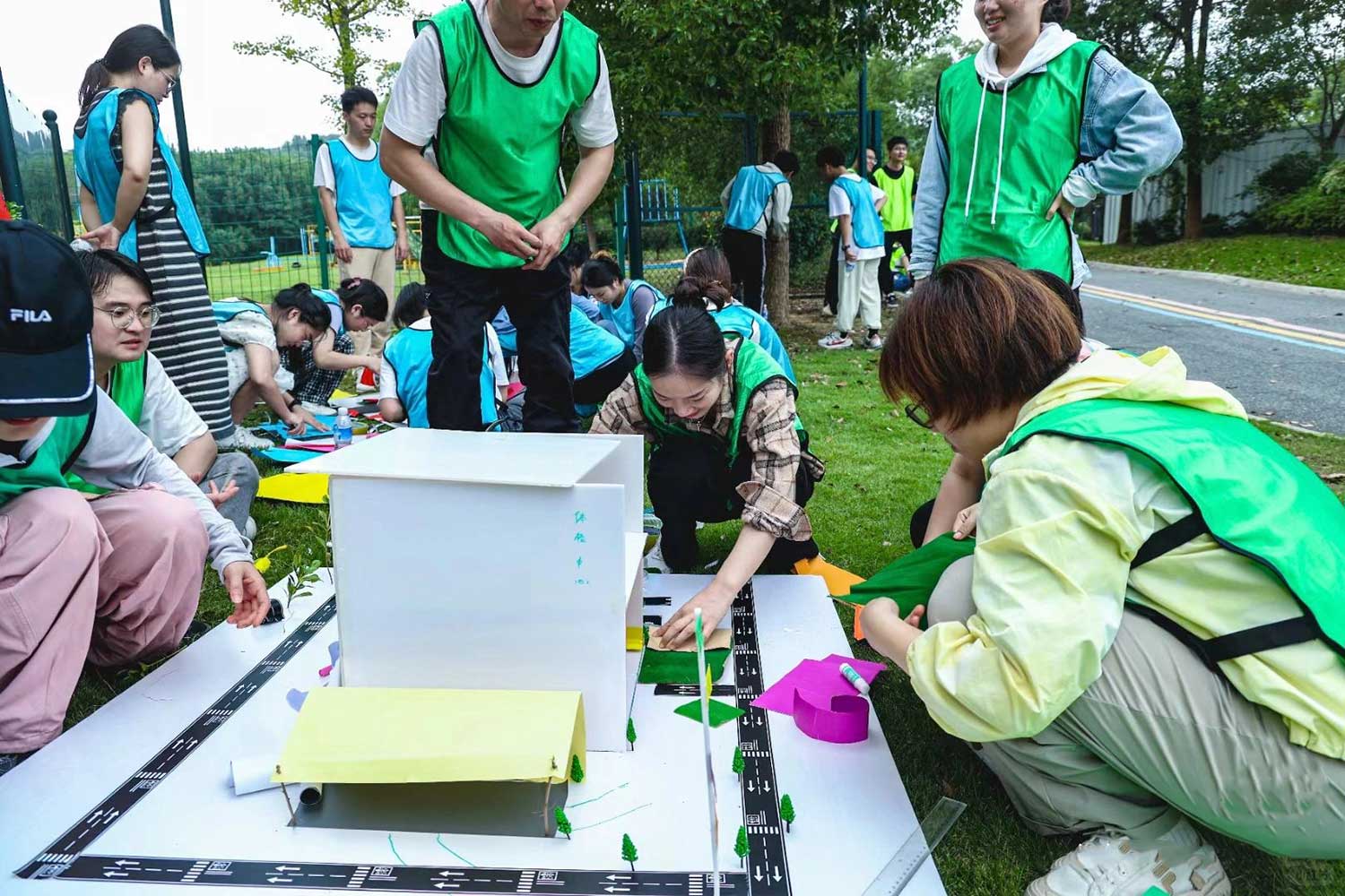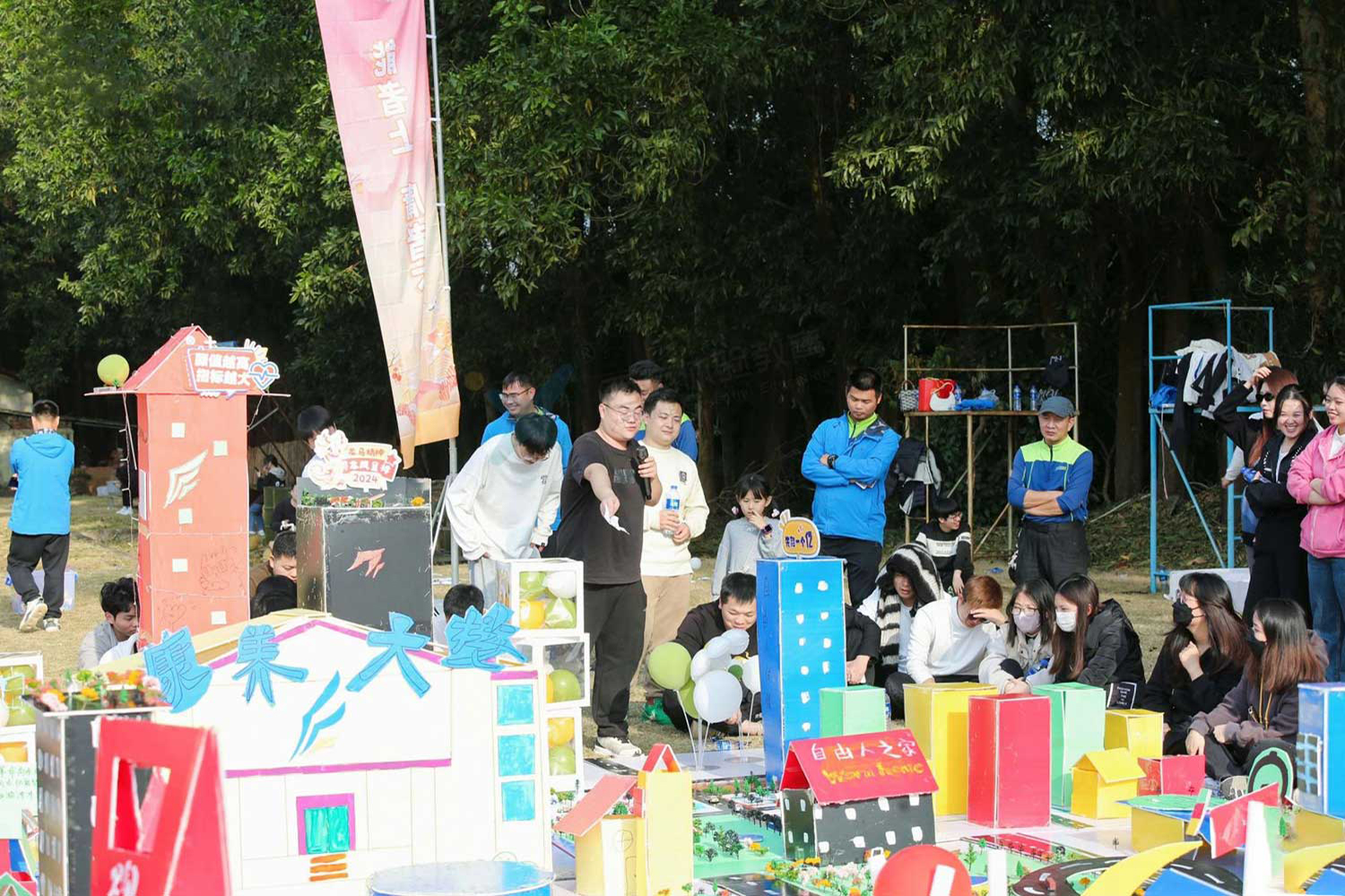 一部分人借助木头等各种基 础资源开始建造;一部分人员通过游戏赢取提高效率的 工具及其他物资等。最后共同完成美好家园,这座家园 由各种不同的建筑装饰组成,代表企业的各种文化 |