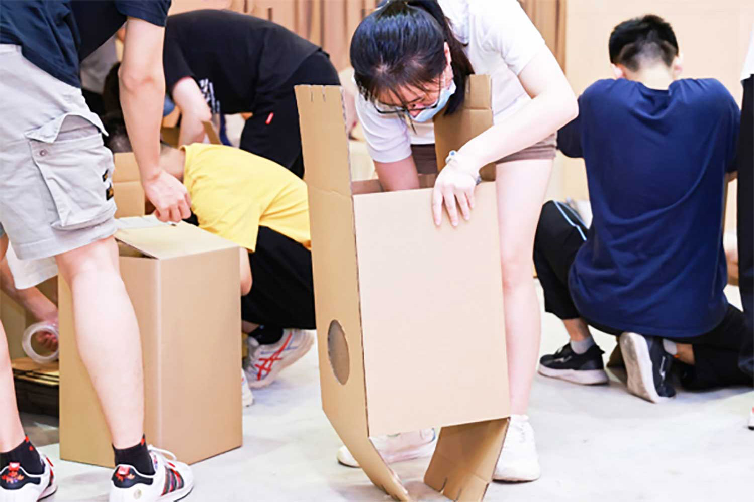 学员们自己制作箱鼓,通过简单的折叠及发声响弦的安装,感受制作乐器的兴奋感。