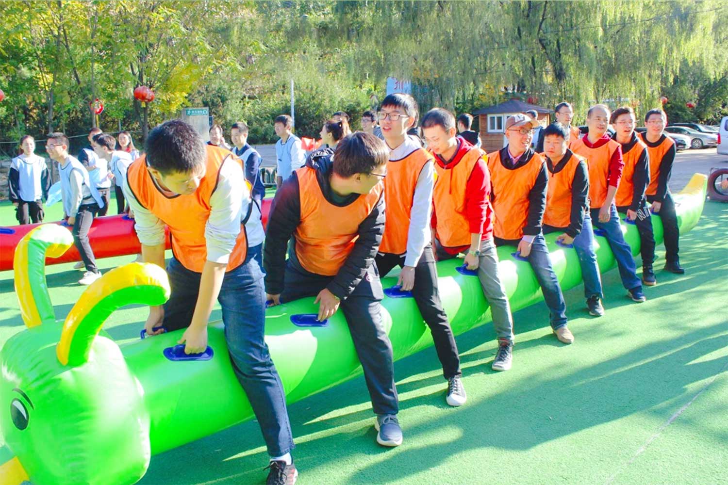 8-10人为一个团队,两人坐在充气垫子上面,4-6人往前推动垫子前行,2人不停的抽换柱子,直达终点。
