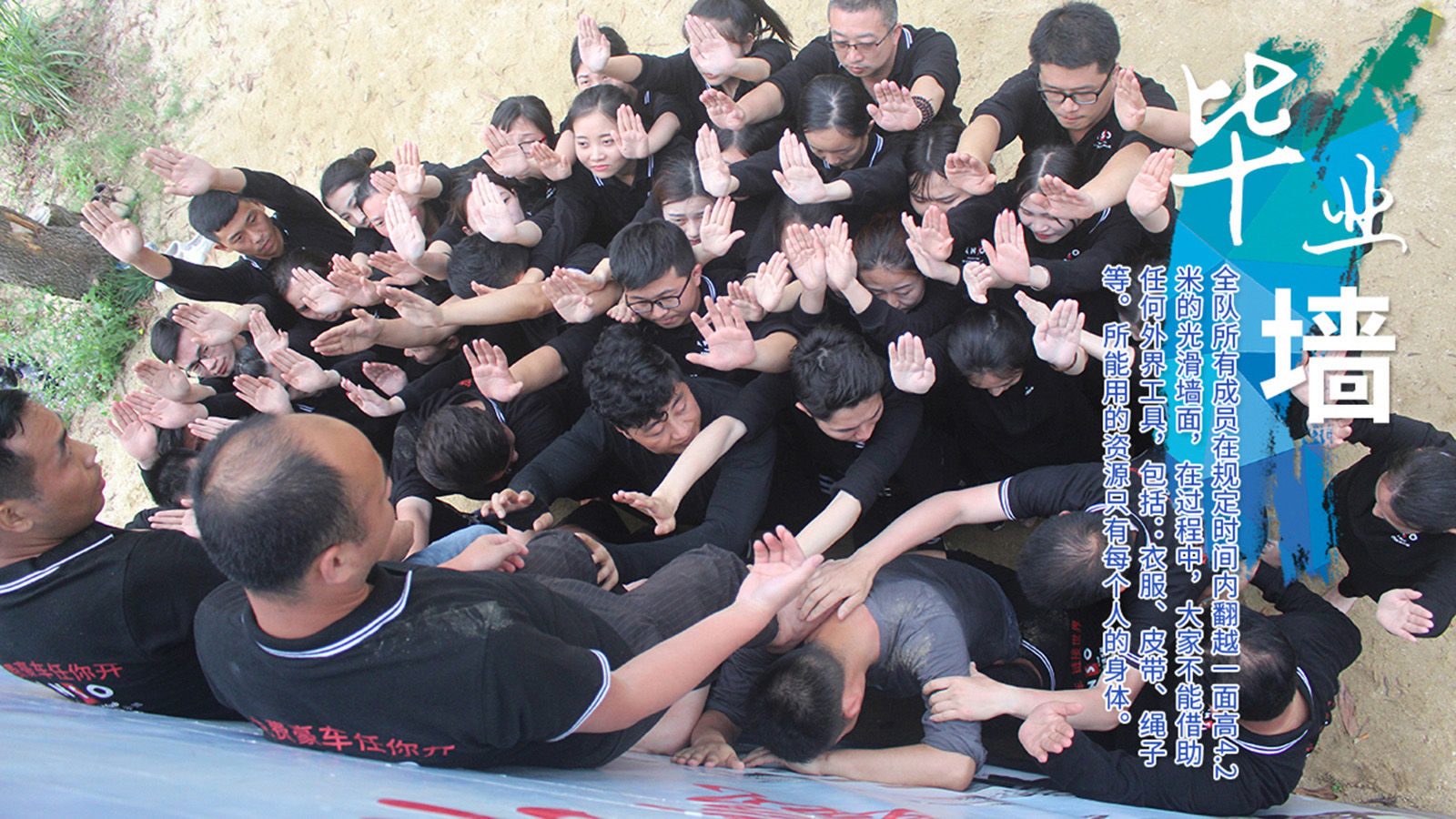 所有参训成员在规定的时间内翻越一面高达4.2米的光滑墙面,在此过程中,大家不能借助任何外界的工具,包括:衣服、皮带、绳子等。所能用的资源只有每个人的身体。