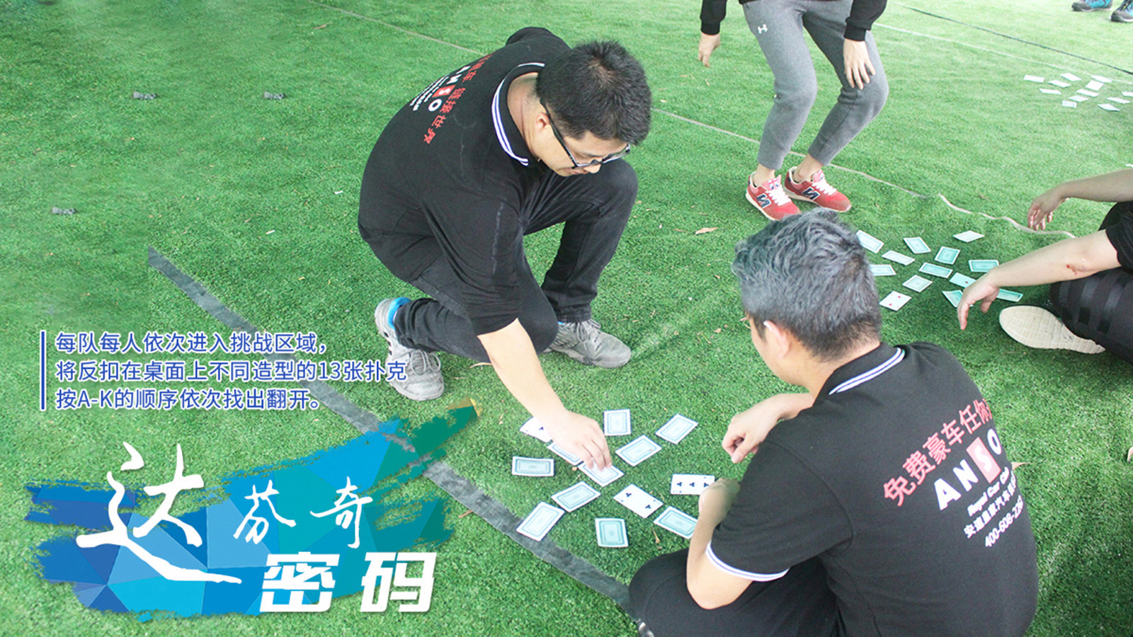 每队每人依次进入挑战区域,将反扣在桌面上不同造型的13张扑克按A-K的顺序依次找出翻开。