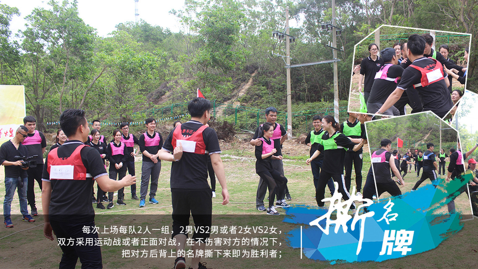 每次上场每队2人一组,2男VS2男或者2女VS2女,直到队伍PK结束。项目规则:双方可以采用运动战或者正面对战,就是在不伤害对方的情况下把对方后背上的名牌撕下来即为胜利者;